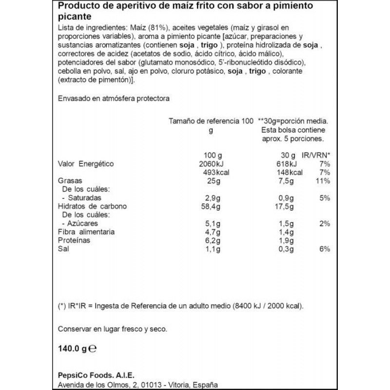 Maíz (81%), aceites vegetales (maíz y girasol en proporciones variables), aroma a pimiento picante [azúcar, preparaciones y sustancias aromatizantes (contienen soja , trigo ), proteína hidrolizada de soja , correctores de acidez (acetatos de sodio, ácido cítrico, ácido málico), potenciadores del sabor (glutamato monosódico, 5?-ribonucleótido disódico), cebolla en polvo, sal, ajo en polvo, cloruro potásico, soja , trigo , colorante (extracto de pimentón)].
